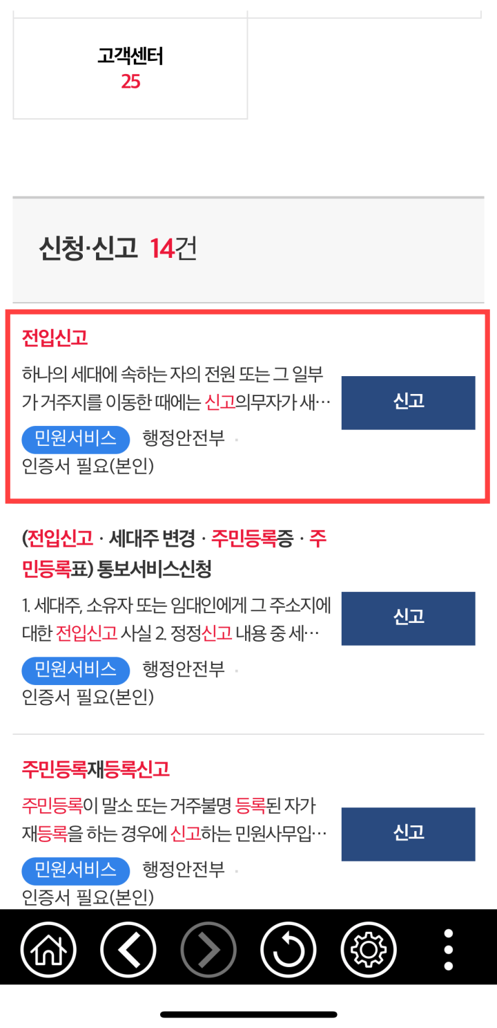 클릭 후 조금 내려보면 나오는 신고 버튼 중 전입신고에 해당하는 신고 버튼을 누르시면 됩니다.
