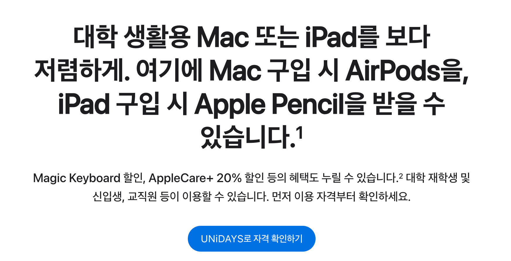 대학 생활용 Mac 또는 iPad를 보다 저렴하게. 여기에 Mac 구입 시 AirPods을, iPad 구입 시 Apple Pencil을 받을 수 있습니다. 자격 확인하기.