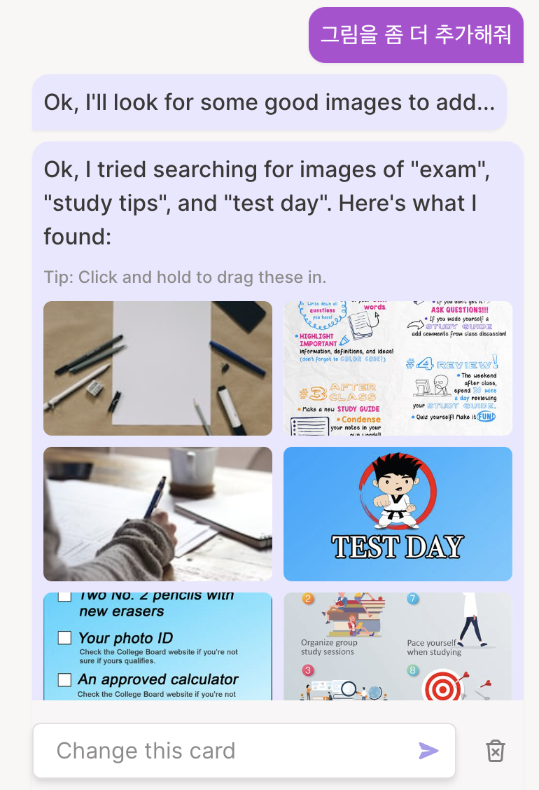 그림을 추천해 주네요. 마우스로 드래그 앤 드랍하면 쉽게 이미지가 추가됩니다.
