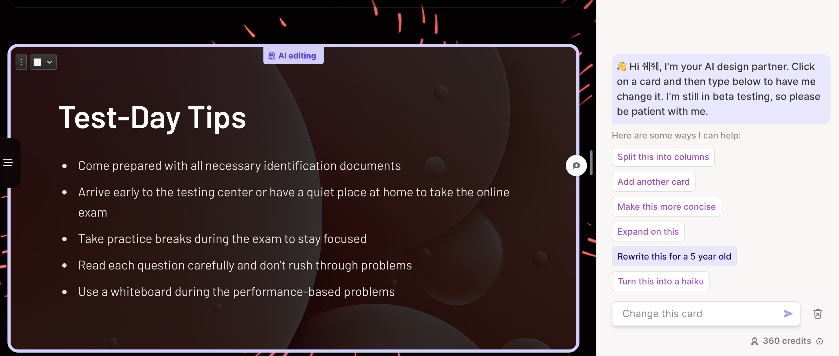 오른쪽에 있는 바 중에 가장 위에 우주인 모양을 누르면 AI와 함께 수정할 수 있습니다.